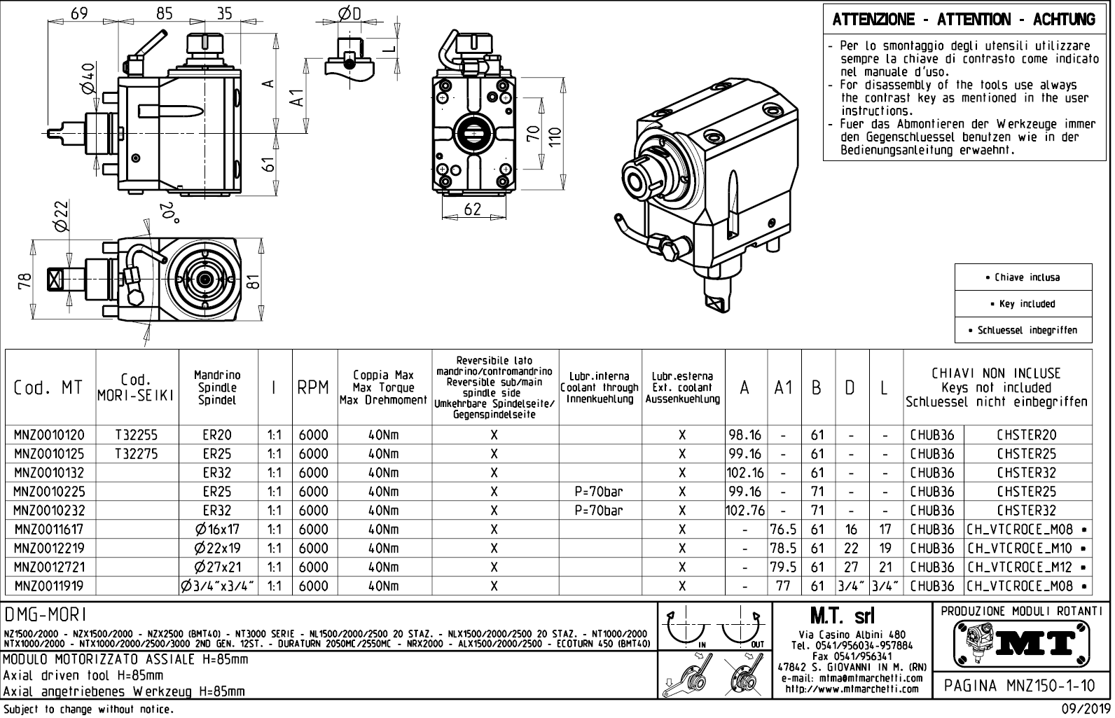 - vnitřní (max.70bar) a venkovní přívod řezné kapaliny.