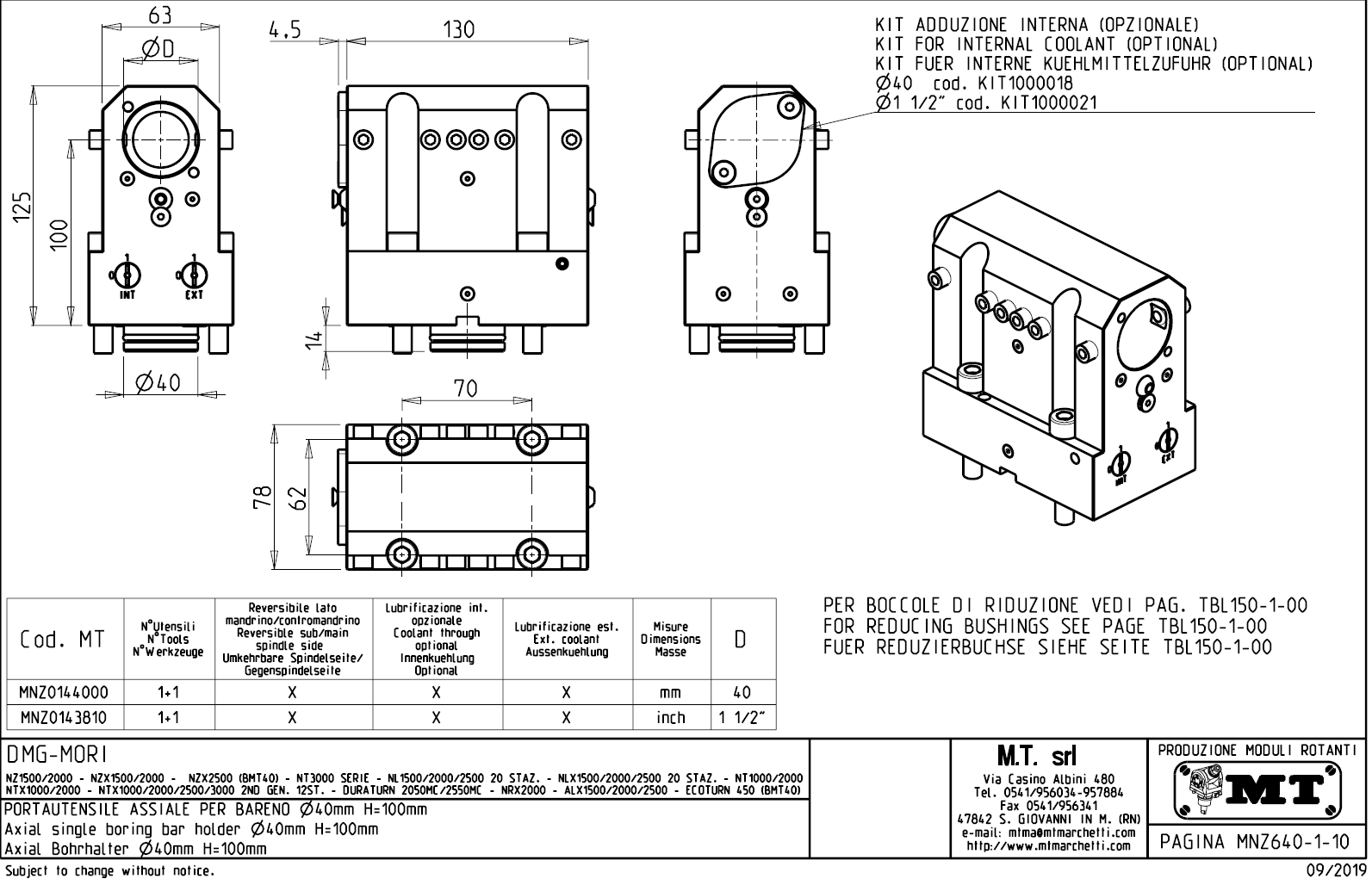 Axiální pevný, statický nástrojový držák pro stroje DMG Mori s nástrojovou hlavou BMT40