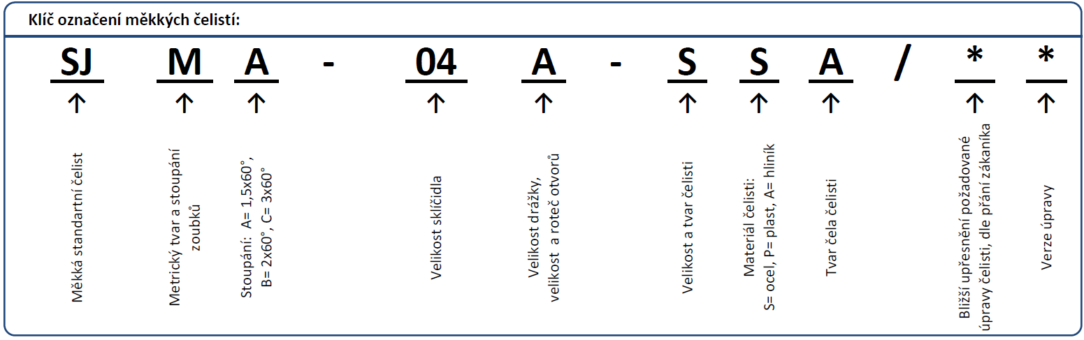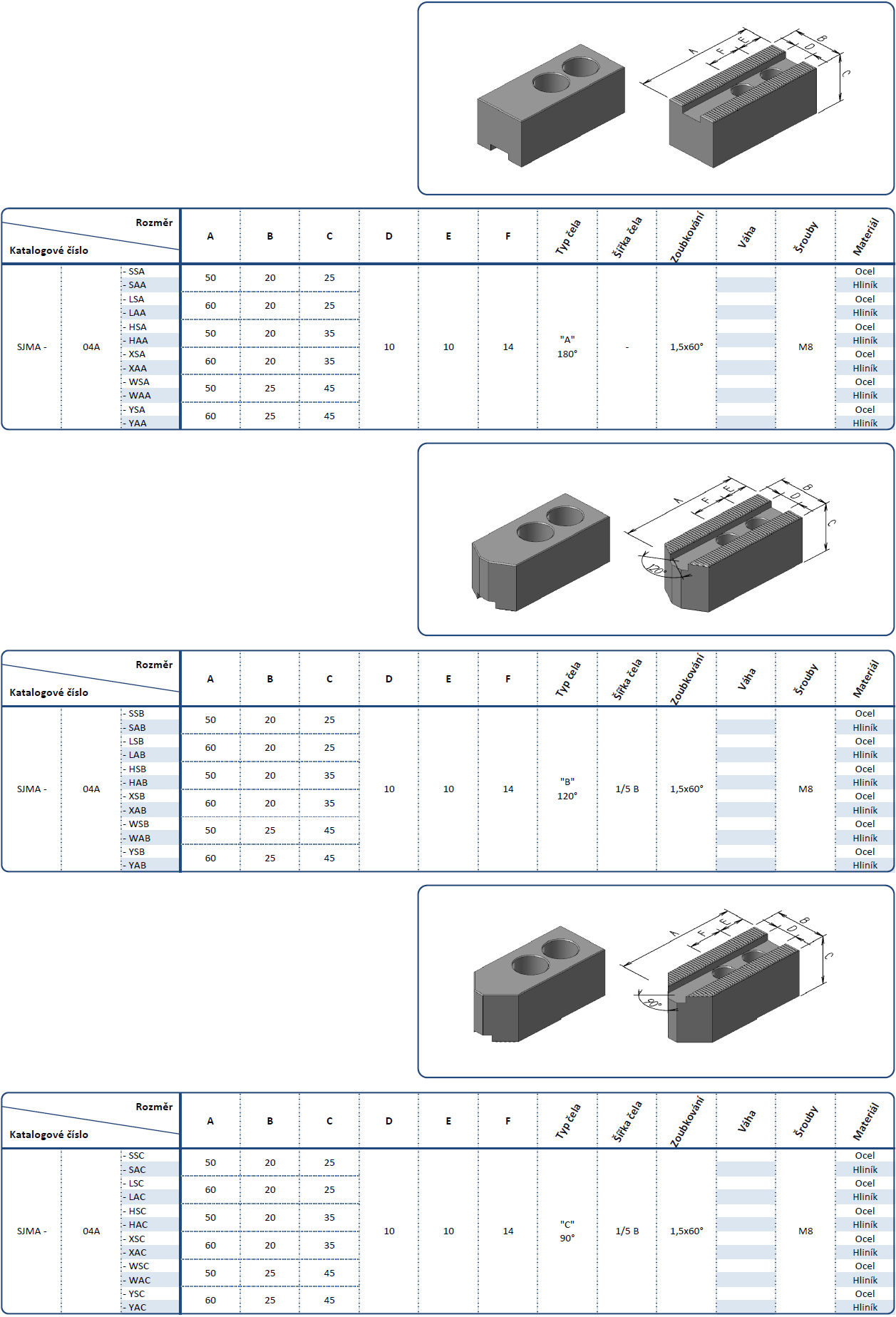 Měkké, ocelové, nástavbové čelisti jsou vyrobeny z materiálu ČSN 14 220, který je vhodný i pro cementování a kalení. Na přání je možné ocelové čelisti též vyrobit z materiálu ČSN 12 050 nebo ČSN 15 142. Hliníkové čelisti jsou dodávány z pevnostního duralu. Plastová verze čelistí je dodávána z materiálu POM-C a to v černé nebo bílé barvě.